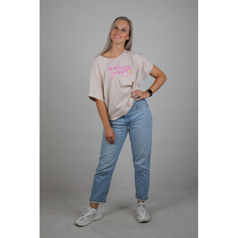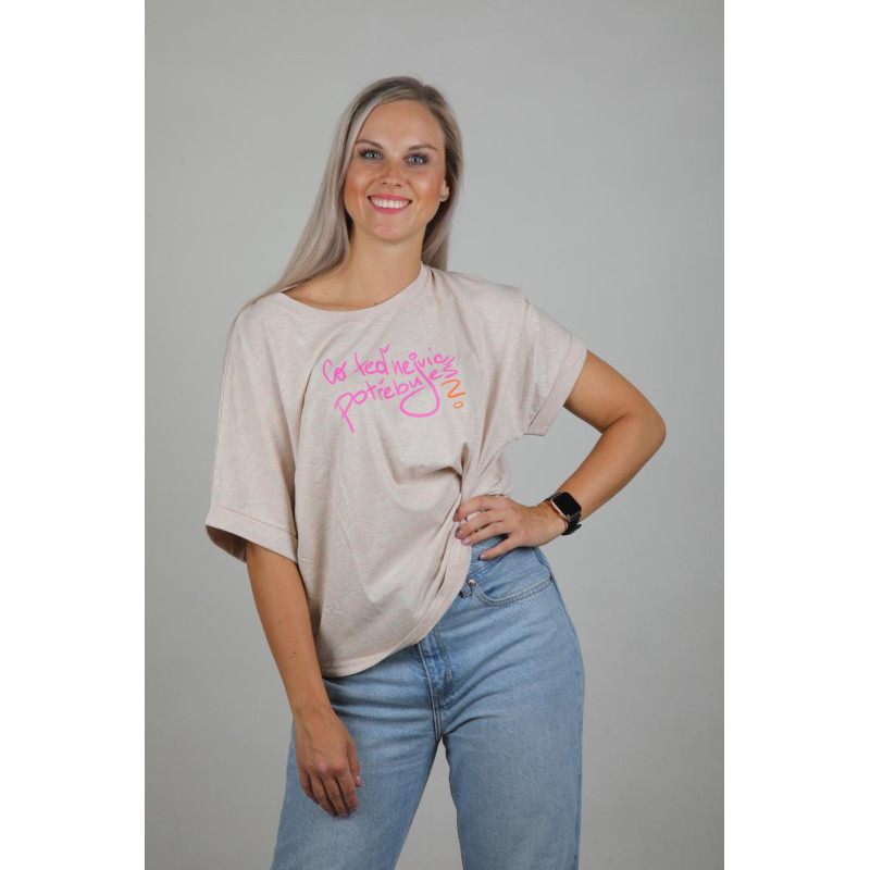 Barva: béžový melír s růžovým nádechem a barevným potiskem vpředu.